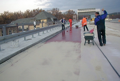 Les grandes surfaces horizontales des ponts et leurs dalles de tablier de chaussée sont soumises à l'attaque de phénomènes environnementaux tels que l'eau, le gel et le sel de déglaçage. Il est donc essentiel que ces dalles soient correctement scellées. Les systèmes purement à base de bitume du passé ne répondent pas aux exigences d’aujourd’hui. Des résultats satisfaisants ne sont obtenus que par l'application d'une première couche d'étanchéité en résine époxy recouverte d'une couche d'usure bitumineuse. Notre résine de pont spéciale MC-DUR LF 480 offre une adhérence optimale au béton et au bitume et peut être appliquée comme un primaire d’accroche, comme une barrière d'étanchéité et  comme enduit anti-rayures et nivelant. Il a également été testé compatible pour des applications telles qu'un mortier PC, offrant des propriétés d'application optimales et facilitant une progression rapide de la construction.